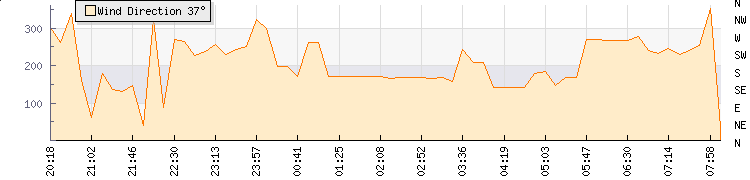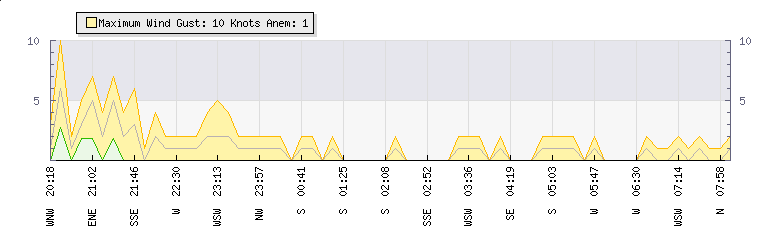 In the last few minutes the wind was Westerly at an average speed of 0 knots, reaching up to 0 knots and a low of 0 knots. The gust strength is0 knots above the minimum speed |