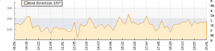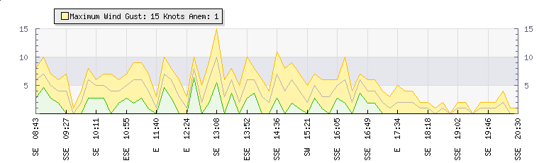 In the last few minutes the wind was Southerly at an average speed of 1 knots, reaching up to 2 knots and a low of 0 knots. The gust strength is2 knots above the minimum speed |
