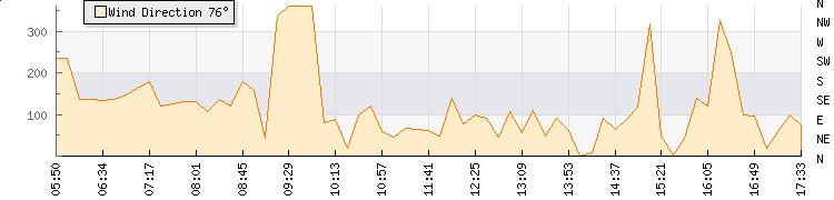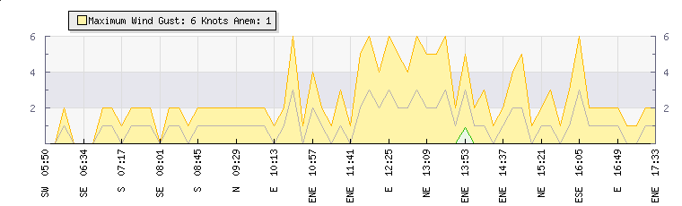 In the last few minutes the wind was East South East at an average speed of 3 knots, reaching up to 6 knots and a low of 0 knots. The gust strength is6 knots above the minimum speed |