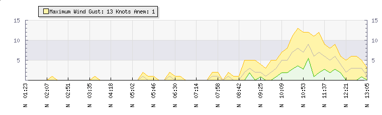 In the last few minutes the wind was Northerly at an average speed of 6 knots, reaching up to 11 knots and a low of 1 knots. The gust strength is10 knots above the minimum speed |