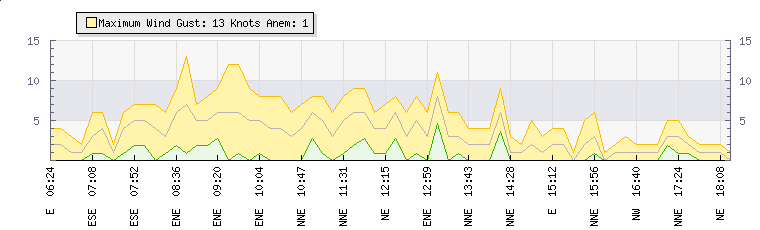 In the last few minutes the wind was North Easterly at an average speed of 1 knots, reaching up to 2 knots and a low of 0 knots. The gust strength is2 knots above the minimum speed |
