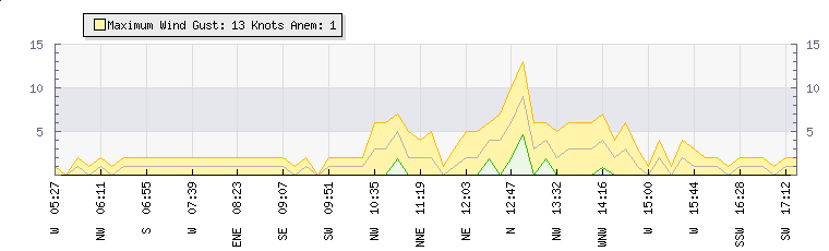 In the last few minutes the wind was Westerly at an average speed of 1 knots, reaching up to 3 knots and a low of 0 knots. The gust strength is3 knots above the minimum speed |