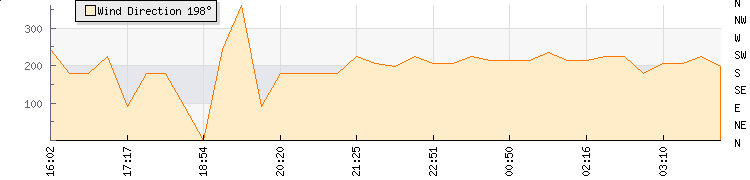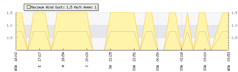 In the last few minutes the wind was South Westerly at an average speed of 1 kmh, reaching up to 2 kmh and a low of 0 kmh. The gust strength is2 kmh above the minimum speed |