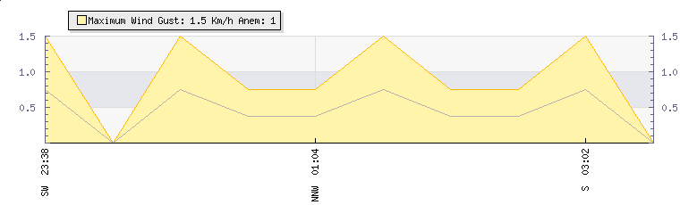 In the last few minutes the wind was Northerly at an average speed of 1 kmh, reaching up to 1 kmh and a low of 0 kmh. The gust strength is1 kmh above the minimum speed |