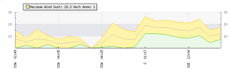Weather Summary: In the last few minutes the wind was South South East at an average speed of 15 kmh, reaching up to 21 kmh and a low of 8 kmh. The gust strength is13 kmh above the minimum speed