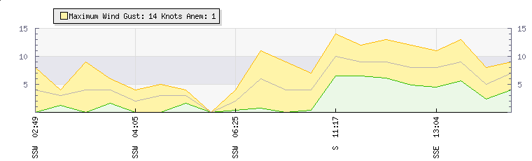 In the last few minutes the wind was South South East at an average speed of 8 knots, reaching up to 11 knots and a low of 4 knots. The gust strength is7 knots above the minimum speed |
