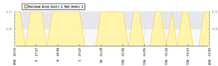 In the last few minutes the wind was South Westerly at an average speed of 1 mph, reaching up to 1 mph and a low of 0 mph. The gust strength is1 mph above the minimum speed |