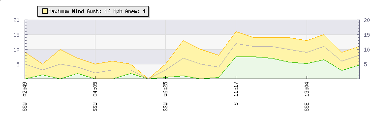 In the last few minutes the wind was South South East at an average speed of 9 mph, reaching up to 13 mph and a low of 5 mph. The gust strength is8 mph above the minimum speed |