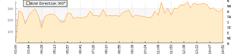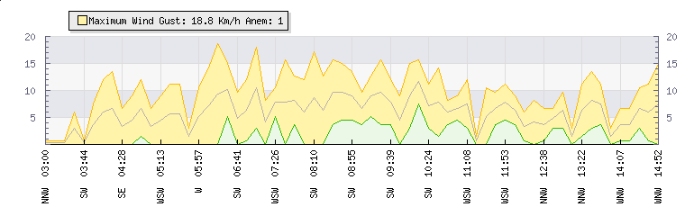 In the last few minutes the wind was Northerly at an average speed of 5 kmh, reaching up to 7 kmh and a low of 3 kmh. The gust strength is4 kmh above the minimum speed |