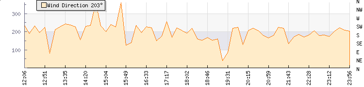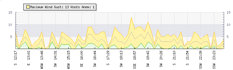 In the last few minutes the wind was Southerly at an average speed of 3 knots, reaching up to 6 knots and a low of 1 knots. The gust strength is5 knots above the minimum speed |