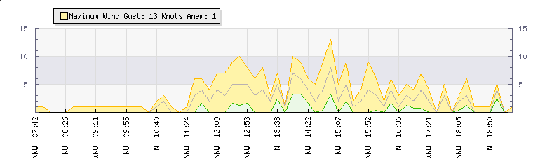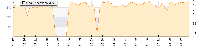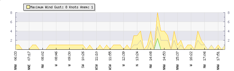 In the last few minutes the wind was North Westerly at an average speed of 1 knots, reaching up to 2 knots and a low of 0 knots. The gust strength is2 knots above the minimum speed |