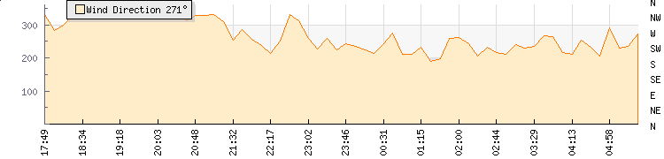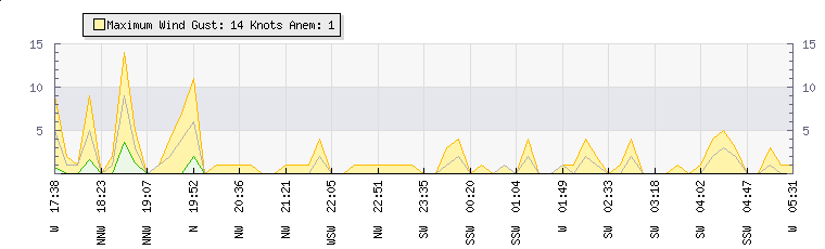In the last few minutes the wind was South Westerly at an average speed of 1 knots, reaching up to 1 knots and a low of 0 knots. The gust strength is1 knots above the minimum speed |