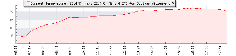 | GPS Co-ordinates: | S 33º 9' 47, E 19º 8' 02 | | ASL: | 2949 feet | | Sunrise / Sunset: | 06:32 / 19:20 | | Beaufort Scale: | Light Air |