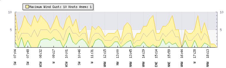 In the last few minutes the wind was West North West at an average speed of 3 knots, reaching up to 5 knots and a low of 1 knots. The gust strength is4 knots above the minimum speed |