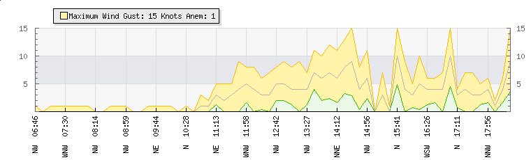 In the last few minutes the wind was Northerly at an average speed of 10 knots, reaching up to 15 knots and a low of 4 knots. The gust strength is11 knots above the minimum speed |