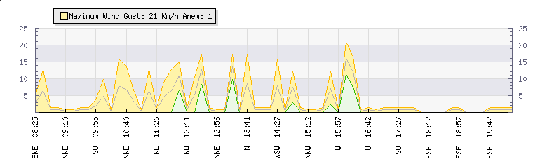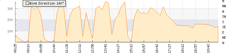 In the last few minutes the wind was South South East at an average speed of 0 kmh, reaching up to 0 kmh and a low of 0 kmh. The gust strength is0 kmh above the minimum speed |