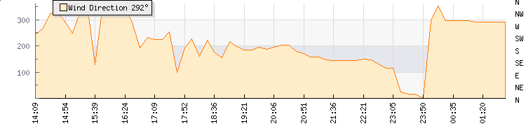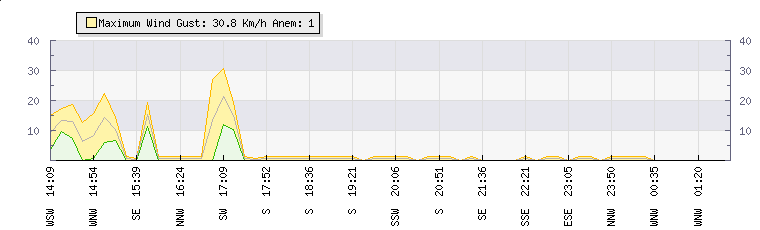 In the last few minutes the wind was West North West at an average speed of 0 kmh, reaching up to 0 kmh and a low of 0 kmh. The gust strength is0 kmh above the minimum speed |