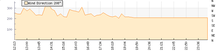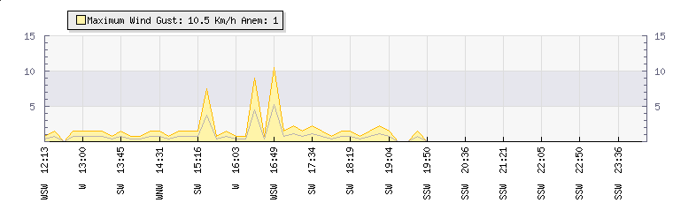 In the last few minutes the wind was South South West at an average speed of 0 kmh, reaching up to 0 kmh and a low of 0 kmh. The gust strength is0 kmh above the minimum speed |