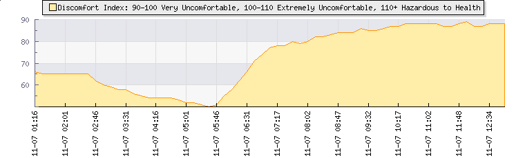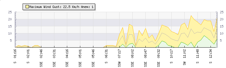 In the last few minutes the wind was South South West at an average speed of 5 kmh, reaching up to 11 kmh and a low of 0 kmh. The gust strength is11 kmh above the minimum speed |