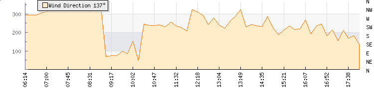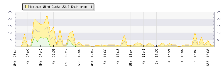 In the last few minutes the wind was South South East at an average speed of 2 kmh, reaching up to 5 kmh and a low of 0 kmh. The gust strength is5 kmh above the minimum speed |