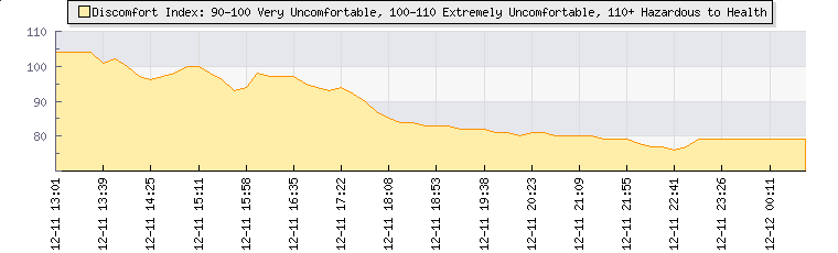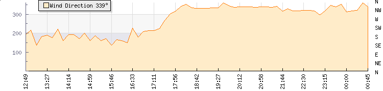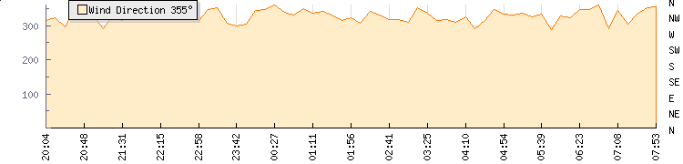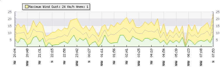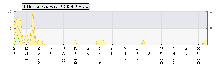 In the last few minutes the wind was North North West at an average speed of 11 kmh, reaching up to 14 kmh and a low of 8 kmh. The gust strength is6 kmh above the minimum speed |