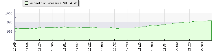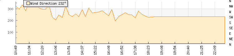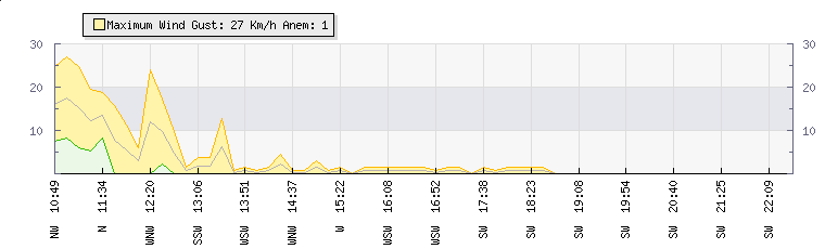 In the last few minutes the wind was South Westerly at an average speed of 0 kmh, reaching up to 0 kmh and a low of 0 kmh. The gust strength is0 kmh above the minimum speed |