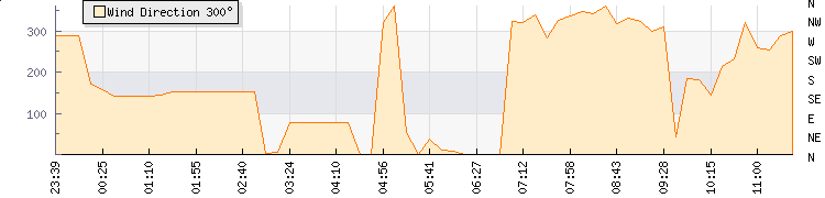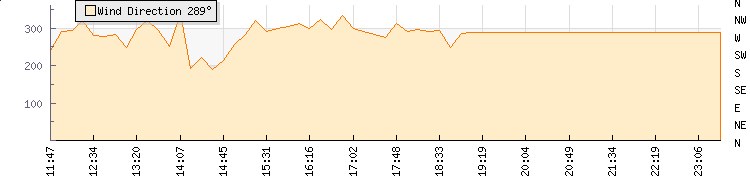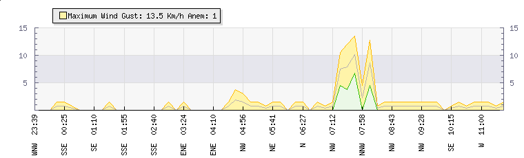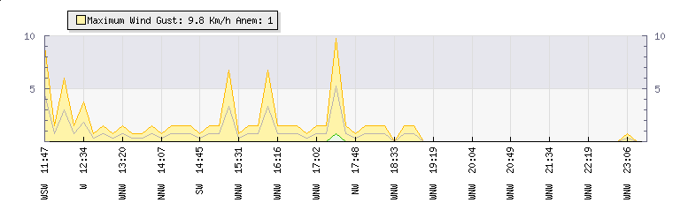 In the last few minutes the wind was Southerly at an average speed of 0 kmh, reaching up to 0 kmh and a low of 0 kmh. The gust strength is0 kmh above the minimum speed |