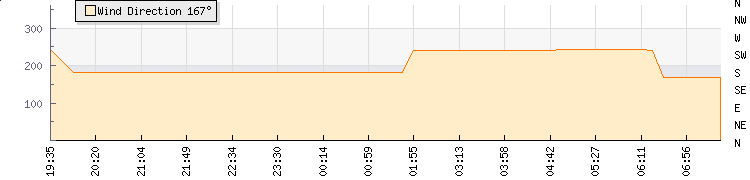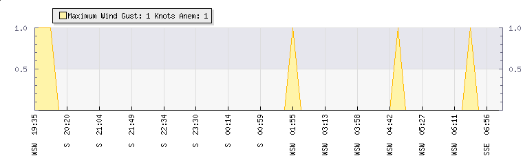 In the last few minutes the wind was West South West at an average speed of 0 knots, reaching up to 0 knots and a low of 0 knots. The gust strength is0 knots above the minimum speed |