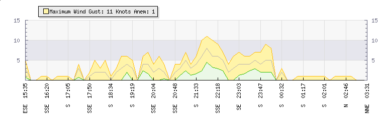 In the last few minutes the wind was Southerly at an average speed of 1 knots, reaching up to 1 knots and a low of 0 knots. The gust strength is1 knots above the minimum speed |