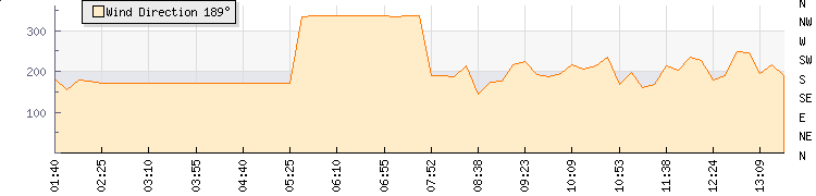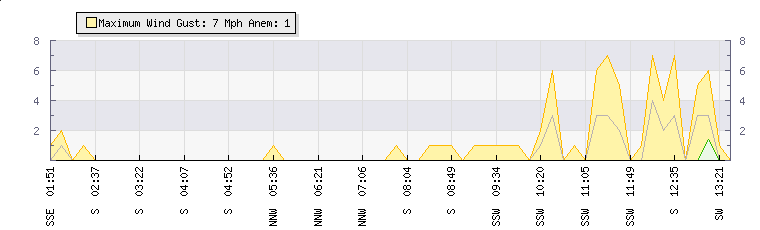 In the last few minutes the wind was South Westerly at an average speed of 1 mph, reaching up to 1 mph and a low of 0 mph. The gust strength is1 mph above the minimum speed |