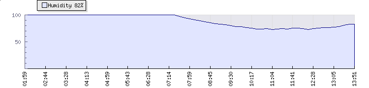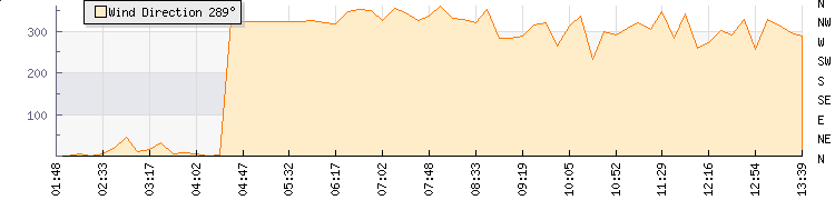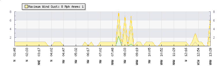 In the last few minutes the wind was Westerly at an average speed of 1 mph, reaching up to 1 mph and a low of 0 mph. The gust strength is1 mph above the minimum speed |