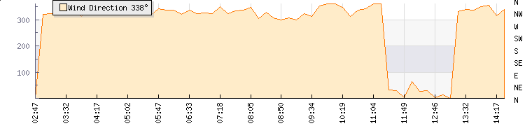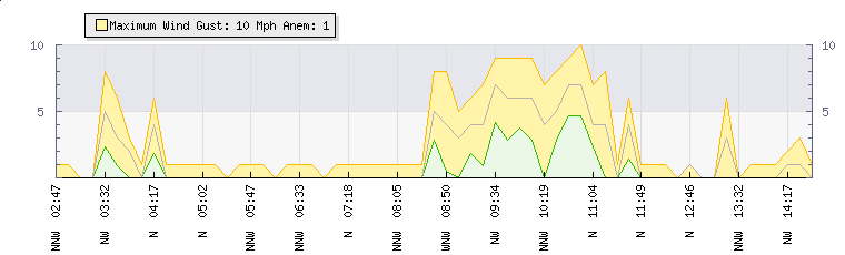In the last few minutes the wind was North North West at an average speed of 0 mph, reaching up to 0 mph and a low of 0 mph. The gust strength is0 mph above the minimum speed |