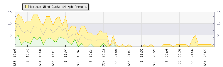 In the last few minutes the wind was Southerly at an average speed of 1 mph, reaching up to 1 mph and a low of 0 mph. The gust strength is1 mph above the minimum speed |