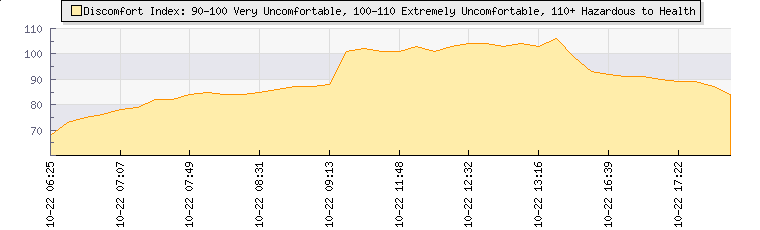 Wind Speed: | 0|1|2 kmh | Wind Direction: | S 169° | Temperature: | 25.8°C | Wet Bulb: | 16.9°C | Discomfort: | 86 | Humidity: | 39% | Rainfall Today: | 0mm | 12 hrs Rainfall: | 0mm | 24 hrs Rainfall: | 0mm | Barometer: | 1018.9mb | Dew Point: | 10.8°C | Clouds AGL: | 6008ft (1831 m) | Density-Alt: | 2326ft (709 m) | Fire Danger: | |