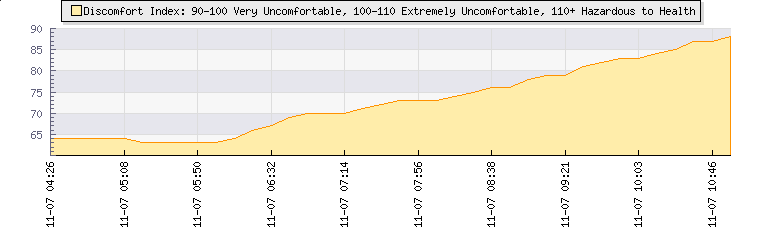 | Wind Speed: | 8|15|23 kmh | Wind Direction: | SSE 156° | Temperature: | 26.5°C | | Wet Bulb: | 18.1°C | Discomfort: | 88 | Humidity: | 43% | | Rainfall Today: | 0mm | 12 hrs Rainfall: | 0mm | 24 hrs Rainfall: | 0mm | | Barometer: | 1018.7mb | Dew Point: | 12.9°C | Clouds AGL: | 5443ft (1659 m) | | Density-Alt: | 2428ft (740 m) | Fire Danger: | |