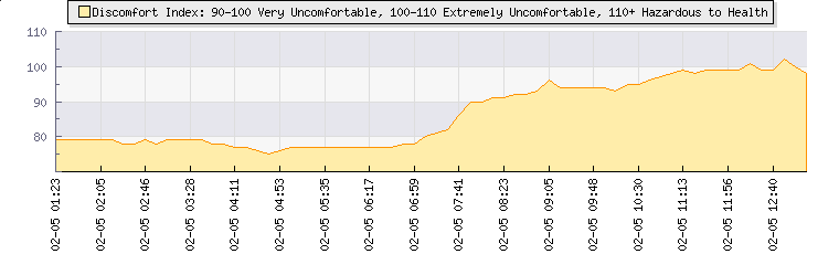 | Wind Speed: | 8|13|18 kmh | Wind Direction: | NW 311° | Temperature: | 29.1°C | | Wet Bulb: | 22.7°C | Discomfort: | 99 | Humidity: | 57% | | Rainfall Today: | 0.5mm | 12 hrs Rainfall: | 0.5mm | 24 hrs Rainfall: | 0.5mm | | Barometer: | 1015.7mb | Dew Point: | 19.7°C | Clouds AGL: | 3761ft (1146 m) | | Density-Alt: | 2927ft (892 m) | Fire Danger: | |
