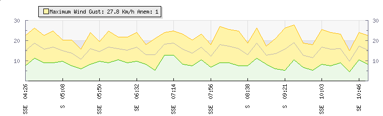 In the last few minutes the wind was South South East at an average speed of 15 kmh, reaching up to 23 kmh and a low of 8 kmh. The gust strength is15 kmh above the minimum speed |