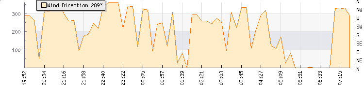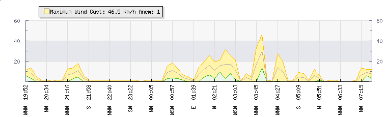 In the last few minutes the wind was West South West at an average speed of 1 kmh, reaching up to 2 kmh and a low of 0 kmh. The gust strength is2 kmh above the minimum speed |