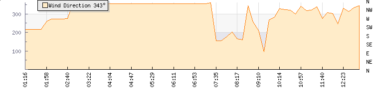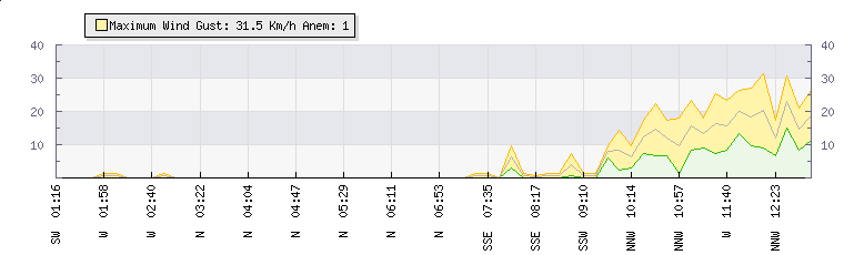 In the last few minutes the wind was North Westerly at an average speed of 16 kmh, reaching up to 23 kmh and a low of 8 kmh. The gust strength is15 kmh above the minimum speed |