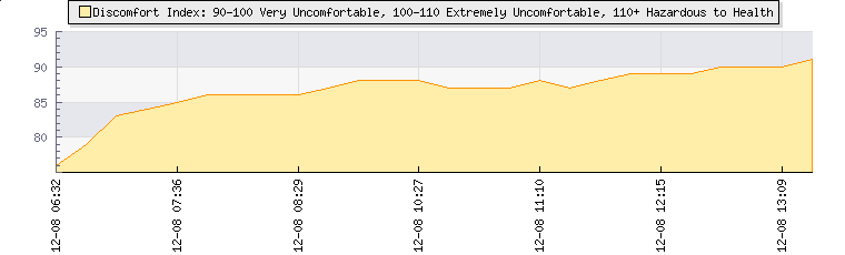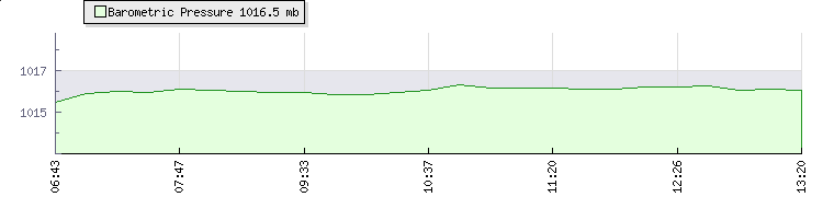 | Wind Speed: | 1|9|17 kmh | Wind Direction: | SW 233° | Temperature: | 28.4°C | | Wet Bulb: | 18.6°C | Discomfort: | 91 | Humidity: | 37% | | Rainfall Today: | 0mm | 12 hrs Rainfall: | 0mm | 24 hrs Rainfall: | 0mm | | Barometer: | 1016.5mb | Dew Point: | 12.3°C | Clouds AGL: | 6445ft (1964 m) | | Density-Alt: | 2710ft (826 m) | Fire Danger: | |