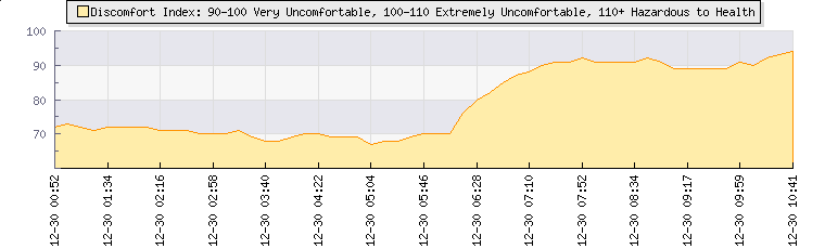 | Wind Speed: | 8|15|23 kmh | Wind Direction: | NW 325° | Temperature: | 28.6°C | | Wet Bulb: | 20°C | Discomfort: | 94 | Humidity: | 44% | | Rainfall Today: | 0mm | 12 hrs Rainfall: | 0mm | 24 hrs Rainfall: | 0mm | | Barometer: | 1019.8mb | Dew Point: | 15.1°C | Clouds AGL: | 5386ft (1642 m) | | Density-Alt: | 2661ft (811 m) | Fire Danger: | |