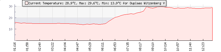 | Wind Gust: | 23 km/h | Min Temp: | 13.9 °C | Max Temp: | 29.6 °C | | Wind Average: | 16 km/h | Min Hum: | 51 % | Max Hum: | 95 % | |  |