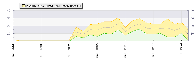 | Wind Gust: | 31 km/h | Min Temp: | 10.8 °C | Max Temp: | 28.4 °C | | Wind Average: | 23 km/h | Min Hum: | 37 % | Max Hum: | 85 % | |  |