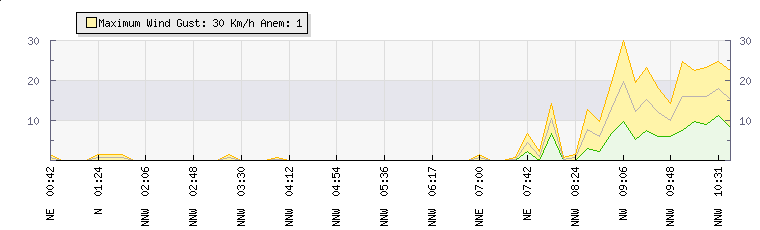 | Wind Gust: | 30 km/h | Min Temp: | 16 °C | Max Temp: | 28.6 °C | | Wind Average: | 20 km/h | Min Hum: | 44 % | Max Hum: | 73 % | |  |