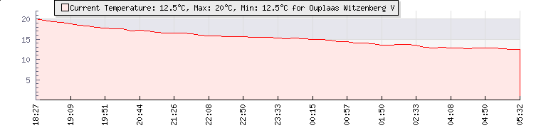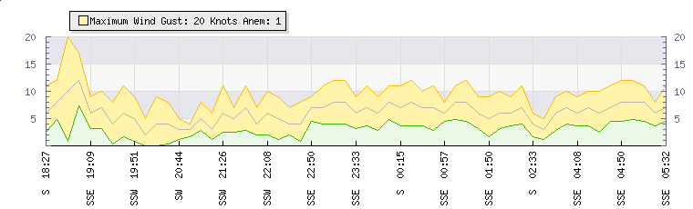 | Wind Gust: | 12 knots | Min Temp: | 13.6 °C | Max Temp: | 15 °C | | Wind Average: | 8 knots | Min Hum: | 61 % | Max Hum: | 66 % | |  |