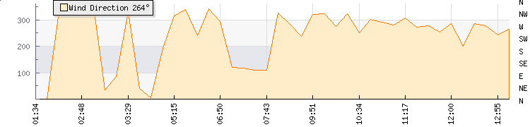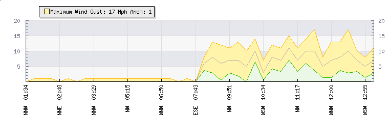 In the last few minutes the wind was East South East at an average speed of 1 mph, reaching up to 1 mph and a low of 0 mph.  The gust strength is1 mph above the minimum speed             |