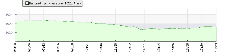 | Wind Speed: | 0|1|1 mph | Wind Direction: | ENE 64° | Temperature: | 22.8°C | | Wet Bulb: | 17.9°C | Discomfort: | 84 | Humidity: | 63% | | Rainfall Today: | 0mm | 12 hrs Rainfall: | 0mm | 24 hrs Rainfall: | 0mm | | Barometer: | 1021.2mb | Dew Point: | 15.4°C | Clouds AGL: | 2968ft (905 m) | | Density-Alt: | 1965ft (599 m) | Fire Danger: | |