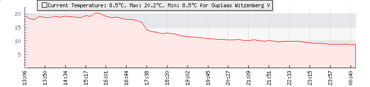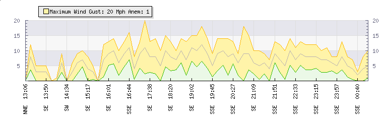 Wind Gust: | 20 mph | Min Temp: | 2.2 °C | Max Temp: | 20.2 °C | Wind Average: | 12 mph | Min Hum: | 31 % | Max Hum: | 100 % | |  |