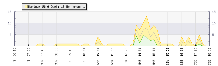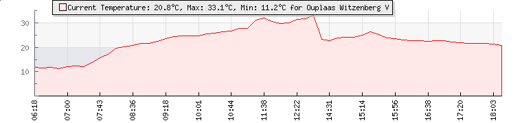 | Wind Gust: | 12 mph | Min Temp: | 11.2 °C | Max Temp: | 33.1 °C | | Wind Average: | 8 mph | Min Hum: | 34 % | Max Hum: | 72 % | |  |