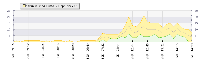 In the last few minutes the wind was South South East at an average speed of 0 mph, reaching up to 0 mph and a low of 0 mph. The gust strength is0 mph above the minimum speed |
